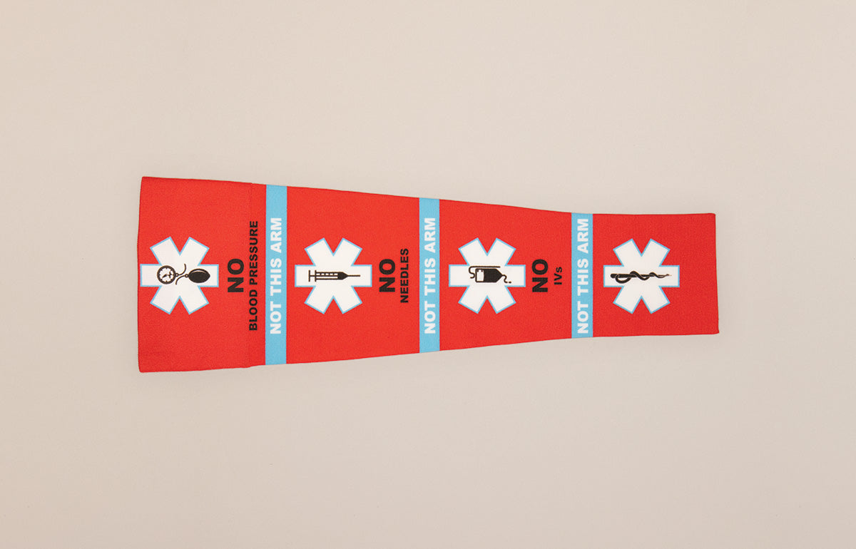Alert Gradient Compression Arm Sleeve features a bold red design with high-visibility medical icons that clearly communicate "NO Blood Pressure, NO Needles, NO IVs" to healthcare providers. A light blue "NOT THIS ARM" banner wraps around the sleeve for added emphasis. Perfect for those managing lymphedema, post-surgery recovery, or mastectomy, Alert ensures your medical needs are immediately recognized. Crafted with moisture-wicking, 4-way stretch fabric for comfortable all-day wear.