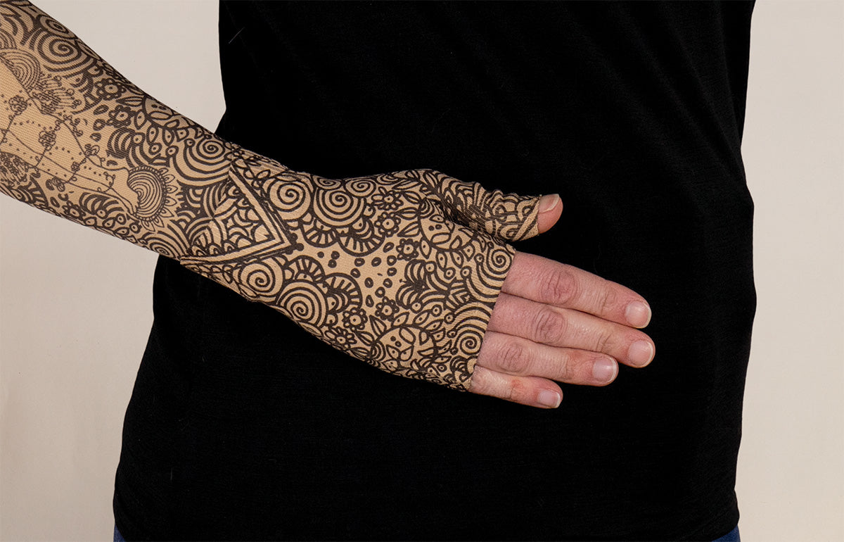 LympheDIVAs Beauty-Full Beige Gradient Compression Gauntlet features an intricate, artistic pattern in warm neutral tones, offering a refined look for everyday wear. This gauntlet provides graduated compression support into the hand to help manage hand lymphedema and is designed to be worn with a compression arm sleeve, which provides compression at the wrist. The wrist is intentionally constructed to remain looser, allowing safe overlap with a sleeve without creating double compression. Made in the USA, this medical-grade compression gauntlet combines therapeutic performance with elevated design.