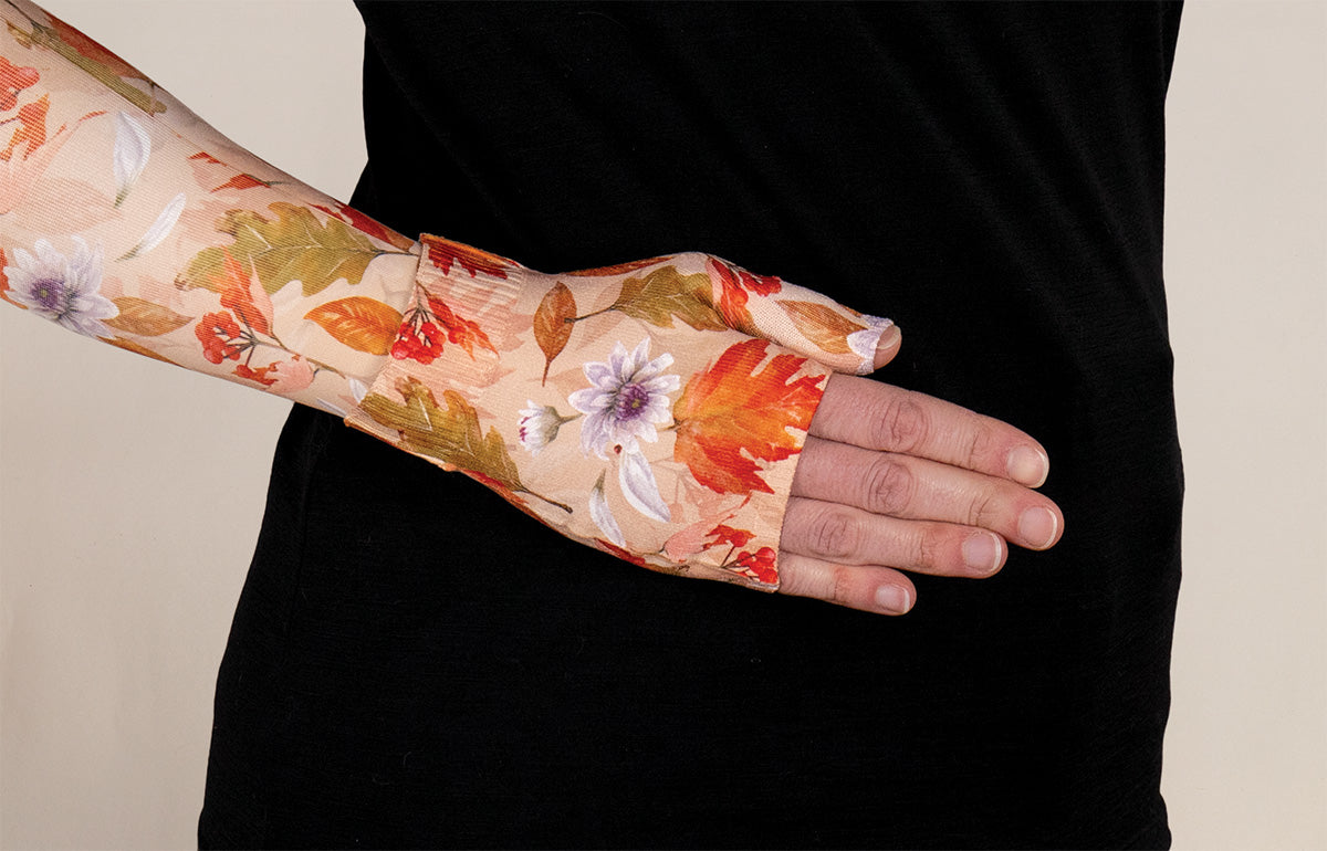 LympheDIVAs Berkshires Gradient Compression Gauntlet combines medical-grade compression with elegant autumn-inspired style. Designed to help manage lymphedema and swelling, this gauntlet provides gentle, graduated compression to promote healthy circulation. The vibrant, fall-themed Berkshires print features warm shades of orange, gold, and soft florals, bringing comfort and confidence to your daily routine. Made with moisture-wicking, breathable fabric and seamless construction for all-day comfort, this compression gauntlet pairs perfectly with the matching Berkshires sleeve for a complete look.