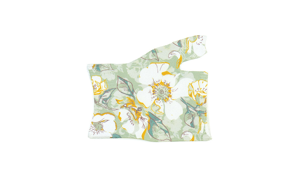 LympheDIVAs Cynthia Gradient Compression Gauntlet brings a breath of fresh air to your medical compression routine. Designed to effectively manage lymphedema, edema, and hand swelling, this gauntlet delivers therapeutic gradient compression to stimulate lymphatic drainage and reduce fluid retention. The lovely Cynthia design features a soft, botanical print of large white blossoms with golden-yellow accents and sketched green leaves set against a soothing sage green background, creating a gentle, nature-inspired look.