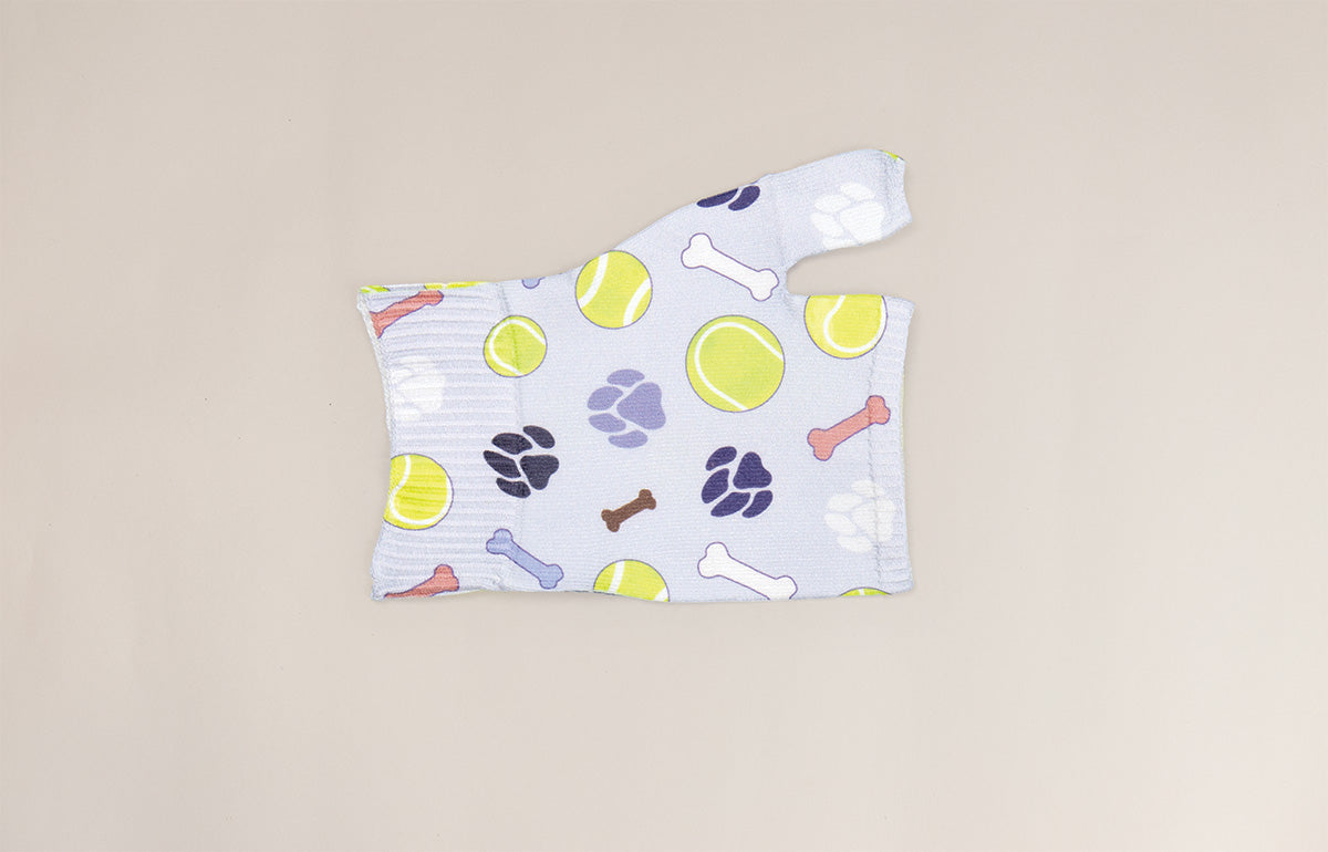 LympheDIVAs Dog Days Gradient Compression Gauntlet brings a playful, puppy-inspired joy to your medical compression routine. Designed to effectively manage lymphedema, edema, and hand swelling, this gauntlet delivers therapeutic gradient compression to stimulate lymphatic drainage and reduce fluid retention. The fun Dog Days design features a whimsical scatter of bright yellow tennis balls, colorful dog bones, and paw prints set against a soft periwinkle blue background, perfect for dog lovers and anyone who wants to add a smile to their day.
